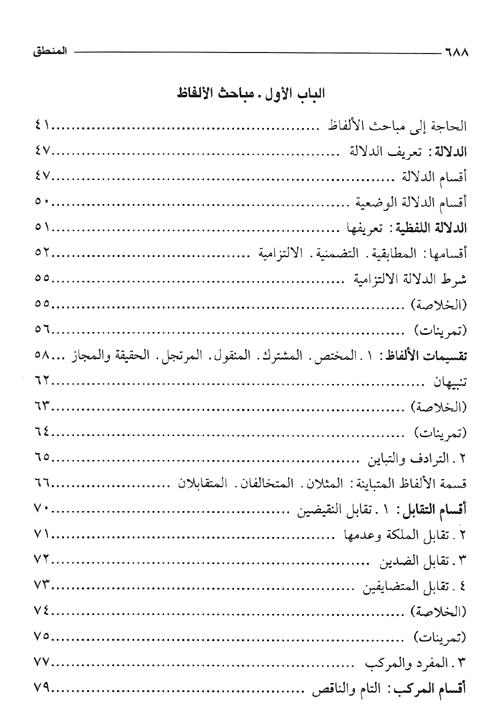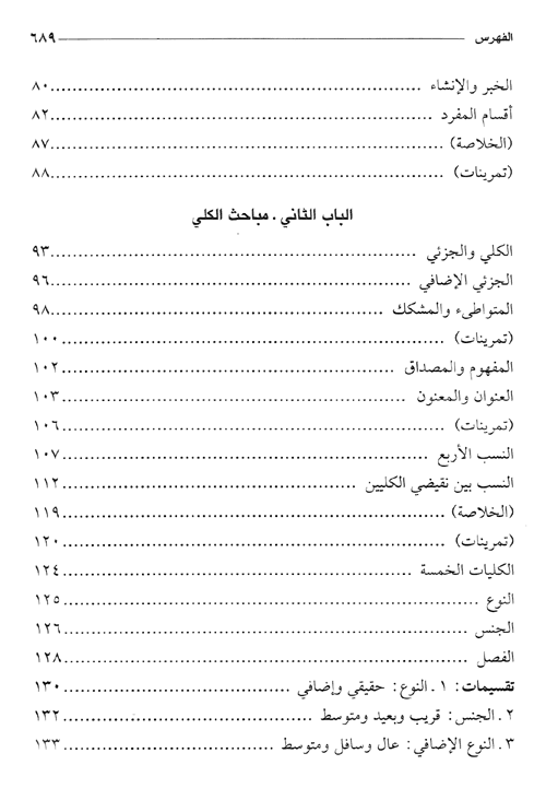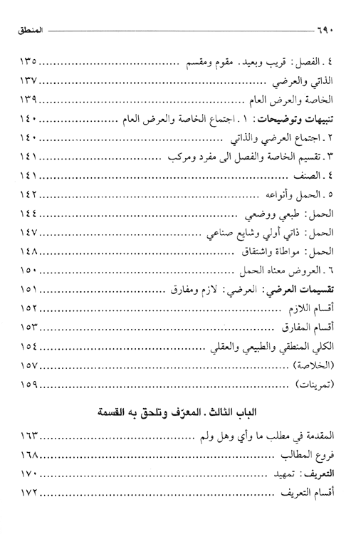 كما أنه يتكفل ببيان الطرق العامة الصحيحة التي يتوصل بها الفكر إلى الحقائق المجهولة. وأبحاث المنطق كما جاءت في هذا الكتاب ستة مباحث الألفاظ، مباحث الكلي، في المعرف وتلحق به القسمة، القضايا وأحكامها، في الحجة وهيئة تأليفها، وفي الصناعات الخمس. وهي تتوزع أبواب الكتاب الستة على التوالي.