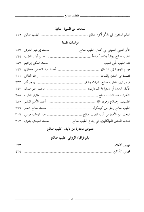 وجمع الكتاب بين دفتيه أجناساً متنوعة من التآليف، تعبّر عن رغبة صادقة للاحتفاء بهذا الروائي المبدع الذي وضع بصماته على بناء الرواية شكلاً ومضموناً، وملأ الدنيا وشغل الناس، وأصبح رمزاً ومعلماً يقتفي آثاره المبدعين الذين ينشدون التميز في الفن الروائي.نبذة الناشر:الطيب صالح هو علامة فارقة في المسيرة الروائية العربية. وقد لاقت أعماله القصصية والروائية رواجاً لم يتمتع به كثير من الكتاب والأدباء العرب، ووجد النقاد في أعماله الروائية فتحاً جديداً في ميدان الرواية العالمية. إلى ذلك فالطيب صالح يتمتع بحيوية ثقافية وصحافية ندر أن توفّرت لسواه من المبدعين.