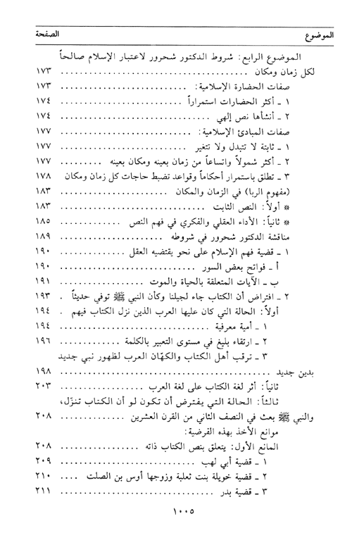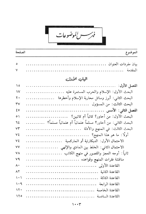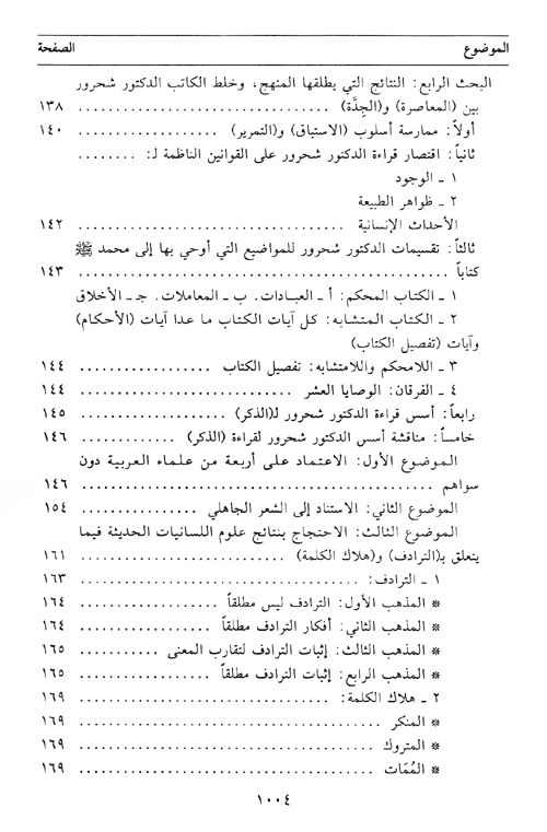 هذا ما سيراه ويتعرض له ويناقشه المؤلف في الباب الثاني والثالث من هذا الكتاب وأما الباب الأول فقد تحدث في فصوله عن الإسلام ومواجهته للباطل، وإذا كانت وسائل خصومه من الكثرة لذا فقد تعرض المؤلف لأبرزها وأخطرها ألا وهي الوسيلة التي تتخذ من الثقافة والعلم ساتراً تختفي وراءه، وتعمد بدهاء لجعل بعض المسلمين، وبعض مثقفيهم بخاصة، أدوات لهذه الحرب، قصدوا بذلك أم لم يقصدوه. كما أنه تطرق في هذا الباب في جهته إلى المسؤول عن هذه الظاهرة، كما بحث في الدور الذي لعبه رموز المسلمين وما كان عليهم أن يلعبوه في هذا المجال، وفي وسائل الرد وكيف يتم الرد على خصوم المسلمين في كل أساليبهم.نبذة الناشر:إن هذا الكتاب هو دراسة تفحّص وتمحيص لكتاب الدكتور محمد شحرور (الكتاب والقرآن قراءة معاصرة) لا قراءة تصفح وتعرف وقد أنفق المؤلف في هذا الكتاب أربع سنوات من العمل المضني، ناقش أطروحاته بتجرد ونزاهة ولا سيما على المستوى المنهجي. إقرأ المزيد
