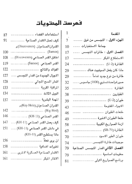 يقسم الكتاب إلى جزئين؛ الجزء الأول "التجسس من فوق" ويتعامل مع تقنية ...التجسس والتي لها مضمون شامل-التقنية التي تكلف بلايين الدولارات لعملها كل سنة، وتقنية التجسس على النطاق القومي الذي يتضمن الطائرات والأقمار الصناعية. أما الجزء الثاني، "أدوات العملاء السرية" فيتعامل مع المعدات الأقل تكلفة (ولكن أحياناً ليس أقل أهمية من النوع الشامل) المستخدمة من قبل الجاسوس.