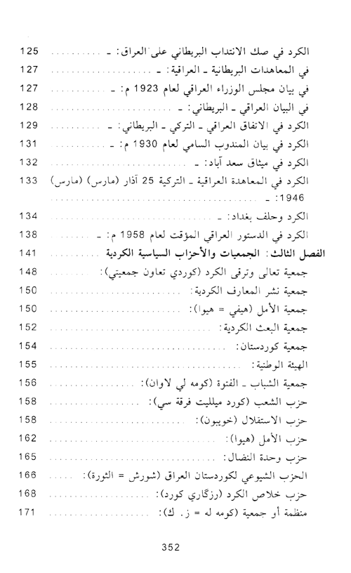 ويعالج الفصل الثالث الحياة السياسية في كوردستان حيث يستعرض بداية يقظة المشاعر الوطنية عند الكرد وظهور الفئة المثقفة منذ أواخر القرن التاسع عشر ويعرض لدورها البارز في المسيرة السياسية للكرد، ثم يتوقف الفصل أمام كل جزء من أجزاء كوردستان ليدرس أحواله السياسية وأوجه النشاط السياسي فيه تمهيداً لفتح صفحة الأحزاب السياسية ودورها على المسرح السياسي الكردستاني. وهنا تمتد الدراسة فلا تتركز حزباً أو جمعية سياسية إلا وتناولتها وتحلل أوضاعها وهياكلها التنظيمية، ومنازعاتها والانشقاقات التي جرت فيها وأسبابها ونتائجها. وتوضح الدراسة دور كل حزب من أحزاب كوردستان في حركة التحرر الوطني الكرجي وحجمه السياسي فيها. واللوحة الحزبية الكردية متداخلة الألوان جداً.