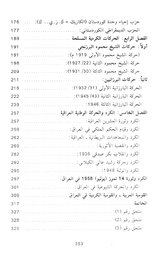 أما الفصل الرابع فلقد تناول الحركات العسكرية المسلحة التي قام بها الكرد في منطقة شمال العراق، ولقد قسمت الدراسة هذه الحركات إلى قسمين أحدهما خاص بالحركات التي قام بها الشيخ محمود أو الحفيد والذي قام بأكثر من حركة مسلحة في النصف الأول من هذا القرن، كان لها أثر كبير على الحياة السياسية في العراق.