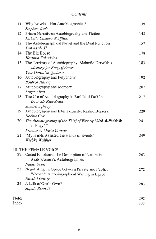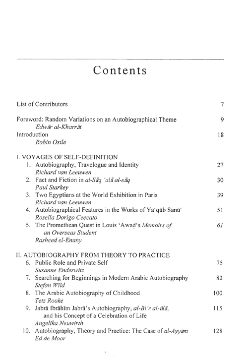 This volume presents the results of the latest research on this subject by leading experts ...on modern Arabic literature from Europe and the Arab world. As such, it questions the view that autobiographu has not been central to the literary tradition of the Arabs, a view which seems to suggest that autobiographu is the preserve of west European Renaissance Man or Woman and their descendants.