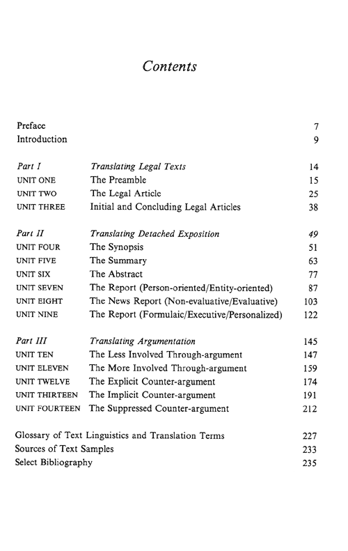 The Guide is divided into three sections: translating legal texts; translating detached exposition; and translating argumentation. Thus the development of the student’s translation skill and strategies starts with objective, non-evaluative texts and progressively moves on to extremely involved and highly evaluative texts.