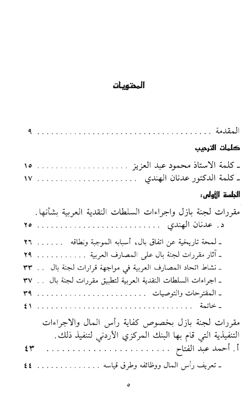 وقد وزعت مواد المؤلف إلى أربعة أجزاء رئيسية، حيث تشتمل الجزء الأول على كلمات الترحيب التي ألقيت في أعمال الندوة. ويتضمن الجزء الثاني ورقة تمهيدية حول الموضوع إضافة إلى ورقة عمل حول تجربة الأردن في تطبيق مقررات لجنة بازل، وورقة عمل حول اتفاقية بازل الخاصة بكفاية رأس مال البنوك مع التعرض لتجربة الأردن في هذا المجال.