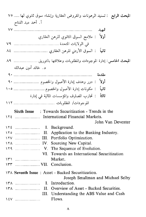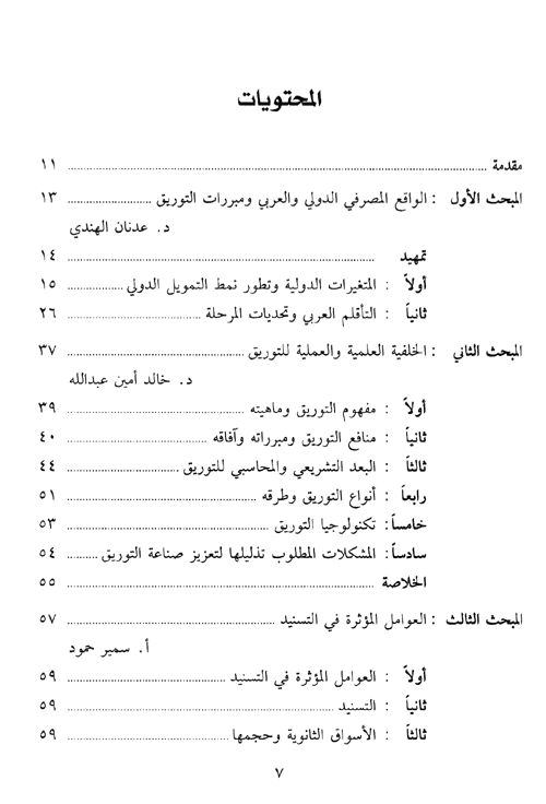 نبذة نيل وفرات:يأتي هذا المؤلف المصرفي ليسلط الضوء على مفهوم وطرق ومزايا التوريق وتطوراته على الساحة العالمية ومبرراته على الساحة العربية وعلاقته بإدارة الموجودات والمطلوبات. وتحديداً فإن القضايا التي يشتمل عليها هذا المؤلف هي التالية: الواقع المصرفي العالمي والعربي ومبررات التوريق، الخلفية العلمية والعملية للتوريق، العوامل المؤثرة في التوريق، التسنيد العقاري ...وتجارب السوق الثانوي للقروض السكنية، إدارة الموجودات والمطلوبات وعلاقتها بالتوريق، التحولات المالية العالمية وعلاقتها بالتوريق، الأوراق المالية المستندة إلى الموجودات، التوريق في العمل المصرفي التجاري. إقرأ المزيد