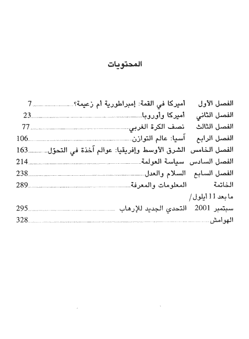 نبذة نيل وفرات:لقد أنتج ميراث تسعينات القرن العشرين تناقضاً ظاهرياً. فالولايات المتحدة من جهة لديها القوة الكافية للإصرار على رأيها والتفوق ما يثير في الغالب التهم بالهيمنة الأميركية. وفي الوقت نفسه، غالباً ما تعكس الوصفات الأميركية لبقية العالم إما ضغوطاً محلية وإما تكراراً لمبادئ عامة مستقاة من تجربة الحرب الباردة. والنتيجة ...أن تفوّق البلد يكون مقترناً باحتمال جدّي لأن يفقد صلته بكثير من التيارات التي تؤثر على النظام العالمي وتحوله في نهاية المطاف. ويكشف المشهد الدولي عن مزيج غريب من الاحترام-والخضوع-للقوة الأميركية يرافقه السخط من وصفاتها والتشوش بالنسبة لأغراضها بعيدة المدى.