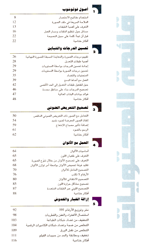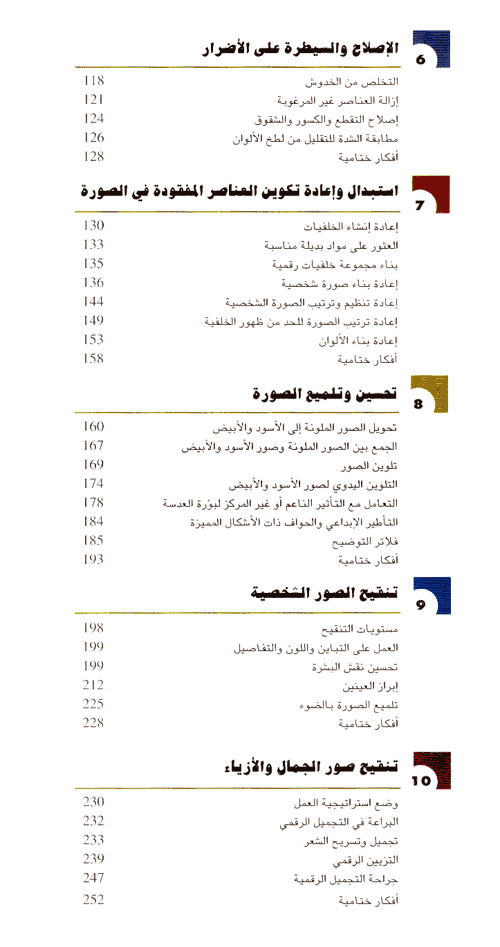 يتضمن هذا الكتاب عشرات المواد التدريبية التي تبيّن لك كيفية تحويل الصور الباهتة المتضررة ...إلى صور جميلة واضحة ونقية كما كانت لحظة التقاطها. في هذا الكتاب المكتظ بالصور الملونة المستخدمة في الأمثلة والتمارين سوف يعلّمك كيفية: