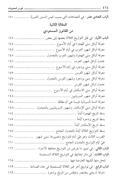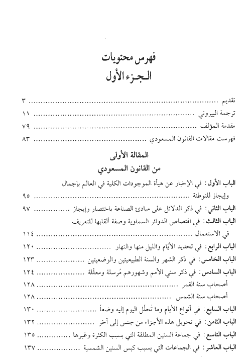 ويشتمل هذا الكتاب على إحدى عشرة مقالة كلٌّ منها مقسمٌ إلى عدد من الأبواب تبلغ في مجموعها مائة واثنان وأربعون باباً تغطي جميع الأرصاد والنظريات الفلكية في ذلك الوقت بالإضافة إلى ما توصل إليه علماء الحضارات السابقة والمعاصرين للبيروني، مع نقد العالم المطلع وتفنيد الآراء دون تحيز أو محاباة.