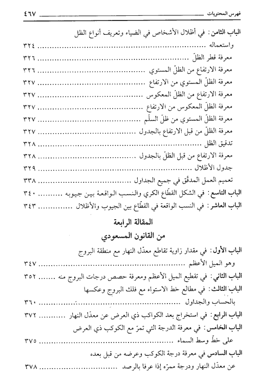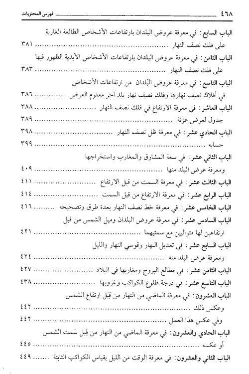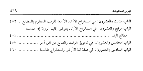 ولما كانت الأرصاد الفلكية على اختلاف أنواعها وما يتصل من تحديد الأوقات وتعيين اتجاهات أماكن العبادة تعتمد على معرفة الجهات الأصلية، فقد أفرد باباً خاصاً لتعيين خطّ نصف النهار. وذكر سبع طرق مختلفة للوصول إلى ذلك، مشيراً إلى مزايا ومساوئ كل منها، وإحدى هذه الطرق من أصل هندي، ناقشها ثم أضاف إليها بعض التحسينات وأخيراً شرح مع البرهان طريقاً هندسياً له يوفر الوقت الذي يقضيه الفلكي في انتظار اللحظات المناسبة للأرصاد.