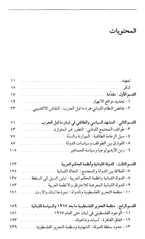 وفي هذا الكتاب يحاول الباحث استعراض التطورات والأزمات الرئيسة التي عصفت بلبنان من كل صوب في تلك الفترة وذلك ضمن عمل تحليلي مفصّل. ويجيء ذلك ضمن أقسام الكتاب الثمانية. القسم الأول يحدد عملية التفكك السياسي من منظور مقارن، ويتطرق إلى النقاش الأكاديمي حول نظام لبنان السياسي في فترة ما قبل الحرب. القسم الثاني يتمحور حول المشهد السياسي والطائفي والأيديولوجي الذي سبق الحرب، ومن ثم يتفحص الباحث في هذا القسم التطور غير المتوازن للطوائف في المجتمع اللبناني وخاصة الطوائف المارونية والسنية والشيعية. القسم الثالث يعالج تطور الدولة اللبنانية ودورها وموقعها من ضمن أنظمة الحكم العربية حيث تتم مقارنة علاقة الدولة اللبنانية ودورها بالمجتمع في لبنان بتلك العلاقة إياها في البلاد العربية، وذلك خلال حالات التأزم المتعلقة بقضايا ذات أبعاد قومية عربية. القسم الرابع يسلّط الضوء على تغيّر طبيعة السياستين اللبنانية والعربية بعد حرب 1967 العربية-الإسرائيلية، وكان أبرز ما شهدته تلك الفترة من تطورات إعلان منظمة التحرير الفلسطينية الكفاح المسلح ضد إسرائيل. وهنا أفرد الباحث فصلاً طويلاً مفصلاً لموضوع اتفاق القاهرة عامة 1969 متبوعاً بفصل آخر يعالج السياستين اللبنانية والعربية في تحولاتهما بعد حرب 1967، كما يشمل البحث هنا المرحلة التي عرفت بالشهابية خلال حكم الرئيس فؤاد شهاب وبعده.
