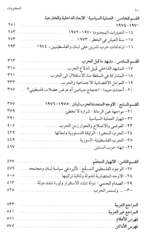 في القسم الخامس يُدرج عرضاً مفصلاً للعملية السياسية وللسياسة الإقليمية بين العامين 1970 و1974. أما القسم السادس فيشرح فيه الباحث المسائل الخلافية التي صبغت النصف الأول من السبعينات مركزاً على مسألتي المشاركة في السلطة والتغيير الاجتماعي والاقتصادي. ويقدم القسم السابع مسحاً لمختلف مراحل حرب العامين 1975-1976 ابتداءً من مواجهة عين الرمانة في نيسان/أبريل 1975؛ وانتهاءً بالحرب الفلسطينية-السورية في خريف 1976. أما القسم الأخير من الكتاب فهو تحليل شمولي للنظام السياسي في لبنان في إطار عملية زعزعة الاستقرار التي كانت الحرب ذروتها. وقد اعتمد الباحث، حيال الفترة التي يغطيها هذا الكتاب، على الصحافة اللبنانية الغزيرة التنوع مصدراً للمعلومات كذلك استخدام ما صدر مؤخراً من مذكرات وكتابات لسياسيين لبنانيين بارزين. بالإضافة إلى هذين المصدرين، استند الباحث إلى موادّ غير منشورة تتعلق بأطراف لبنانية وفلسطينية شاركت في الحرب، كما كان قد اطلع على تقارير ومعلومات رسمية حول أحداث وقعت قبل الحرب أو في أثنائها، وهذا مكنه من إلقاء الضوء على تطورات محورية.