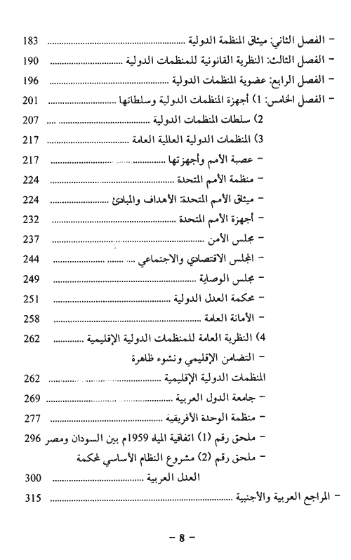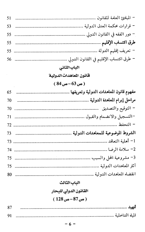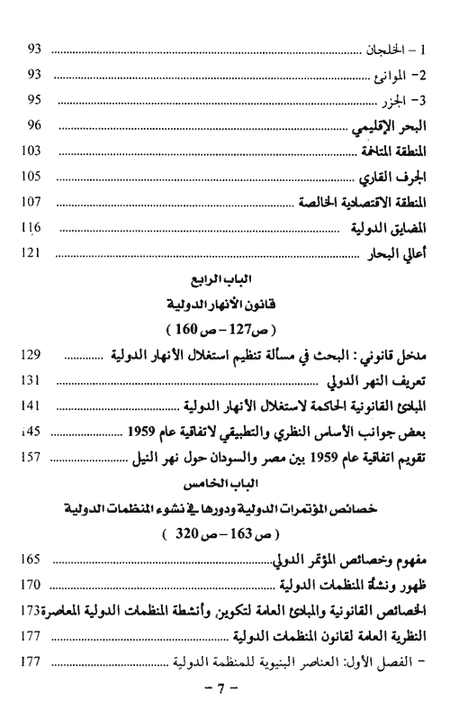 الباب الأول: النظرية العامة للقانون الدولي العام. الباب الثاني: قانون المعاهدات الدولية. الباب الثالث: القانون الدولي للبحار. الباب الرابع: قانون الأنهار الدولية. الباب الخامس: خصائص المؤتمرات الدولية ودورها في نشوء المنظمات الدولية. إقرأ المزيد