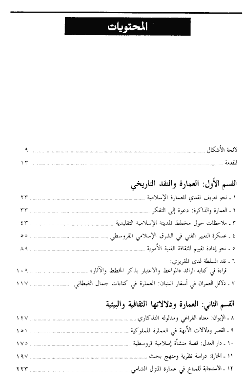 وهذا هو بيت القصيد من هذا الكتاب الذي يطمح الباحث أن يكون لبنة في بناء ثقافة العمارة في العالم العربي. والكتاب عبارة عن مجموعة من البحوث والمقالات عن تاريخ ونقد العمارة جمعت وفق خمسة أقسام تبعاً لمواضيعها ومناهجها. القسم الأول "العمارة والنقد التاريخي" يشمل سبعة بحوث نقدية، ديدنها المراجعة التاريخية والنقد المنهجي والنظري في سبيل رؤية أوضح وسبر أعمق لظواهر مهمة في التاريخين العربي والإسلامي.