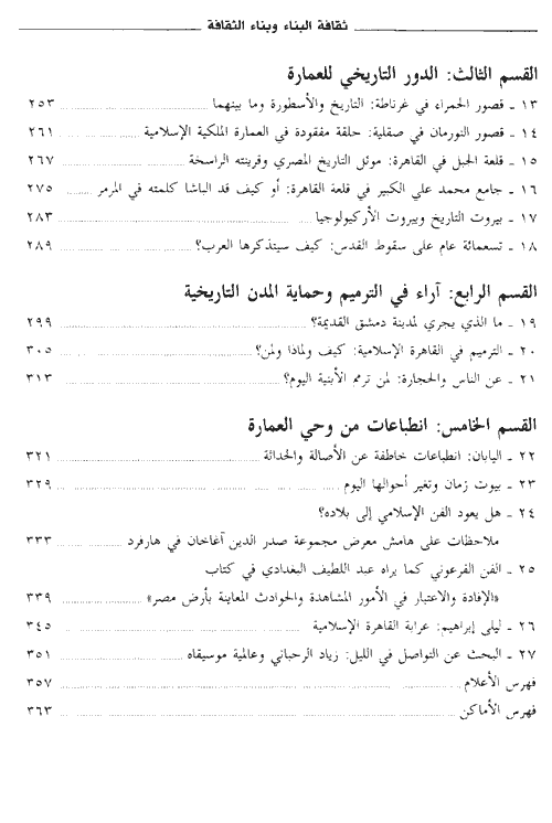 أما القسم الثاني "العمارة ودلالاتها الثقافية والبيئية" فهو يحتوي على خمسة بحوث نظرية. أما القسم الثالث "الدور التاريخي للعمارة" فهو يضم ستة مقالات تسعى إلى تحليل وفهم نماذج معمارية تاريخية مهمة من التراث العربي وتحاول من خلال هذه النماذج إغناء فهمنا لتاريخ العصور التي أنتجتها وتلك التي أدخلتها في تراثها. القسم الرابع "آراء في الترميم وحكاية المدن التاريخية" يركز على سؤال عملي واحد: ما الذي يمكن أن نفعله لحفظ مدننا التاريخية القديمة من دون أن نفرغها من سكانها ونحولها إلى متاحف في الهواء الطلق. أما القسم الخامس فهو عبارة عن ستة مقالات تتناول مواضيع متنوعة تتراوح في فحواها بين ذكريات طفولة وانطباعات سفر وملاحظات عن أشخاص. وعليه فقد أعطاها الباحث هذا القسم عنواناً هو "انطباعات من وحي العمارة". إقرأ المزيد
