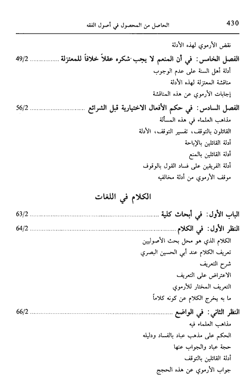 نبذة نيل وفرات:لو لم يكن للإمام الأرموي من المؤلفات إلا كتاب الحاصل، ذلك فخراً، فهو من الكتب التي سار ذكرها وتناولها الناس بالتدارس. وهو من كتب الأصول المهمة التي اشتملت على كل ما يحتاج إليه الدارس لعلم الأصول، من أبحاث ومسائل أصولية. وقد رتّبه مؤلفه تاج الدين الأرموي على النحو التالي: ...الكلام في المقدمات، الكلام في اللغات، الكلام في الأوامر والنواهي، الكلام في العموم والخصوص، الكلام في الأفعال، الكلام في الناسخ والمنسوخ، الكلام في الإجماع.