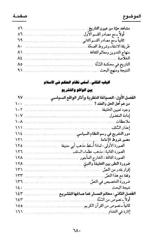 وفي الباب الثاني تناول النظرية السياسية عند المسلمين منذ نشأتها، إذ كانت في يومها الأول مفتاحاً للواقع الجديد لمرحلة ما بعد الرسول صلى الله عليه وسلام. وابتداءً من هذا الباب التزم المؤلف عن البديل الصحيح لكل قضية لا تصمد أمام النقد، ولا يسندها البرهان العلميّ.