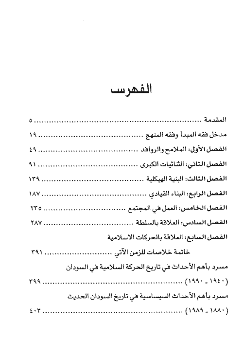 والأستاذ محمد بن المختار الشنقيطي درس هذه التجربة، وحاول بنهجية الباحث، وعقلية الناقد، وانسيابية الأديب، أن يقدم خلاصات مفيدة عن آداء الدكتور الترابي وأخوانه في العمل التنظيمي والبناء القيادي والعمل داخل المجتمع ومع السلطة ومن أن ينسى روافد الحركة وملامحها وعلاقاتها الخارجية، هذا مع وقفه مع ما أسماه الكاتب "الثنائيات الكبرى" وهدفه ليس مدح الحركة الإسلامية في السودان، أو القدح في غيرها من الحركات الإسلامية، بل تقديم العبرة إلى شباب الصحوة، وتعميق ثقافتهم العملية، والتعريف بتجربة إسلامية رائدة، تعاضد ظلم ذوي القربى وكيد الأبعدين على طمسها، والحيولة دون أخذ العبرة منها وليحيط المؤلف بجميع جوانب موضوعه قسم دراسته إلى سبعة فصول عرض فيها ما يلي: "في الفصل الأول والذي هو بعنوان الملامح والروافد بين الخلفية الفكرية التي انطلقت منها الحركة في عملها، ومنهج الربط بين فقه المبدأ وفقه المنهج الذي اعتمدته، كما وتحدث عن الملامح العامة للحركة وخصائصها المميزة، وفي الفصل الثاني "الثنائيات الكبريوفية" شرح منهج الحركة في التعامل مع ست من الثنائيات التي تشكل معضلات فكرية وعملية أمام الحركات الإسلامية، ويتوقف على حسن التعامل معها مسار كل حركة ومآلها وهي: الشكل والمقصد، الإسرار والإعلان، الالتزام والمبادرة، الوحدة والتباين، العمق والامتداد، الفصل والوصل. وفي الفصل الثالث: البنية والهيكلية جمع بين الشرح والمخططات التوضيحية ليتحدث عن هيكلية الحركة وشعبها وفروعها، وتأثروا تأثيرها في الحركات الإسلامية الأخرى، كما وأبرز في هذا الفصل مواطن التجدد والتميز والتكيف لديها، مع مقارنته لهيكلية هذه الحركة بحركة كل من الإخوان المسلمين بمصر، الجماعة الإسلامية بباكستان، باعتبارهما أقدم تجربتين إسلاميتين في هذا المضمار، وأكثرهما تأثيراً في الحركات التالية. وفي الفصل الرابع "البناء القياديوفية" شخص آداء القصور القيادي في الحركات الإسلامية، وبين منهج الحركة السودانية في اختيار قادتها وعزلهم، وما اعتمدته من طرائق لحماية الشورى، وضمان صدق التمثيل، وشمول القيادة وفعاليتها، وضمان مراقبتها ومحاسبتها، مع التأصيل والتحليل والمقارنة. وفي الفصل الخامس تناول فلسفة الحركة في التعامل مع مجتمعها، وبين المنهج الإصلاحي الإيجابي المترفق الذي درجت عليه في هذا الشأن، وتعاملها مع مختلف القوى الاجتماعية المحلية: الأحزاب السياسية، والجيش، والطلاب، والعلماء، والصوفية، والسلفية، والنساء، والعمال، والقبائل، والمسيحيين. وفي الفصل السادس حلل منهج الحركة في علاقتها بالسلطة السياسية، والضوابط التي تحكمت في معارضاتها للسلطة وتحالفها معها، مع التركيز على تجربة التحالف مع نميري في نهاية السبعينيات وبداية الثمانينات، من حيث الدواعي، وأسباب النجاح، والثمرات، باعتبارها أكبر وأخطر قرار اتخذته الحركة في هذا الشأن. أما في الفصل السابع والأخير فبين رؤية الحركة لمراتب العموم والخصوص بين الحركات الإسلامية، ومنهجها في العلاقة بتلك الحركات، خصوصاً حركة الأخوان المسلمين بمصر، والتنظيم الدولي للإخوان المسلمين، بحكم ارتباطهما الفكري والتاريخي بالإسلاميين السودانيين ومكانتهما في العمل الإسلامي عالمياً. إقرأ المزيد