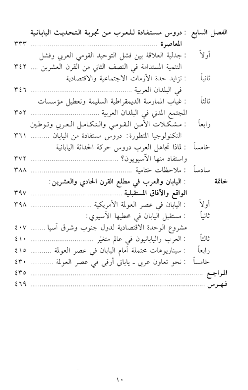 إن دراسة معمقة لمسار النهضة اليابانية في مختلف مراحلها تظهر بالملموس مدى فائدة دروس تجارب التحديث الآسيوية لإطلاق نهضة عربية جديدة. فالعرب واليابانيون قد استوردوا التكنولوجيا الغربية بكثافة في الفترة التاريخية السابقة. ولا ينكر اليابانيون هذه الظاهرة يل يعترفون بتقدم الغرب عليهم في تلك المرحلة بشكل لا لبس فيه. وهم نقلوا عن الغرب، ومستحدثون في نقل أحدث أشكال التكنولوجيا التي هم بحاجة إليها دون عقد أو مركب نقص. وليس من شك في أنهم تساووا في عملة الاقتباس هذه من جميع الشعوب التي استوردت التكنولوجيا وتدربت على العلوم العصرية الغربية المتطورة، ومنها الشعوب العربية.