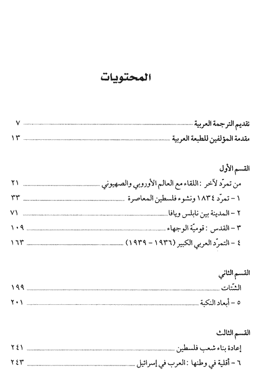 ويصدر هذا الكتاب بالعربية بعد أن أضاف إليه المؤلفان وعدّلا فيه، ليشمل آخر المستجدات على ساحة الصراع، حتى سنة 2001، باذلين جهوداً خاصة في تقديم طبعة عربية مزيدة ومنقحة، ومتميزة أيضاً عن الأصل الإنكليزي (صدر عام 1993) وعن الترجمة العبرية (الصادرة عام 1999). كان المؤلفان يبذلان جهداً كبيراً في إعداد النص المعدل للقارئ العربي، والفلسطيني بوجه خاص، ويستجيبان بذلك لتحديات تطرحها كتابة تاريخ الشعب الفلسطيني الحديث بصورة مغايرة بل متعارضة مع الروايات الصهيونية الرسمية التي عرفناها حتى الآن لتاريخ الصراع. وهما بذلك ينكشفان أمام الرأي العام الفلسطيني والعربي، ما قد يجعل من مادتهما متداولة لدى الباحثين وعلى مختلف الصعد. إقرأ المزيد