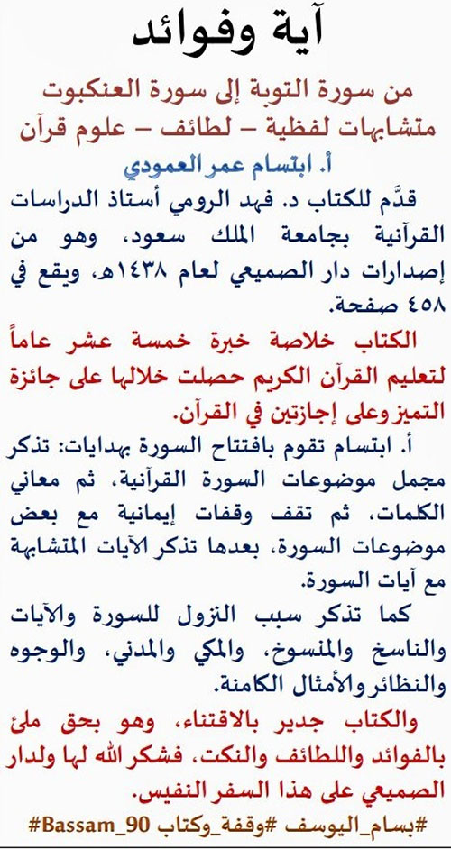 آيه وفوائد من سورة التوبة إلى سورة العنكبوت ؛ متشابهات لفظية - لطائف - علوم قرآن