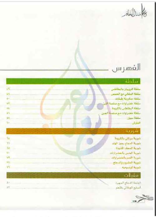 هذا وقد إبتدأت كتابها بوصفات السلطة الشهية المهمة جدا على المائدة والتي يتم تقديمها في بداية الوجبة أو كمرفق مع الطبق الرئيسي، وأفضل أنواعها السلطة الخضراء والتي تحتوي على نسبة كبيرة من الأوراق الخضراء وتشكيلة من الخضروات الطازجة، وهناك العديد من أصناف السلطة يدخل في تركيبها بعض الحبوب والبقول أو بعض اللحوم أو الأسماك، فتعتبر كأنها وجبة خفيفة. حيث من المهم التركيز على أسلوب تقديم السلطة بشكل جذاب فاتح للشهية, وابتكار أفكار للتقديم تعتمد على استغلال تلك الألوان الجذابة والمتناسقة للخضروات فيكون طبق السلطة لوحة مرسومة تتزين بها المائدة على شكل طبق واسع يجذب الأنظار ويفتح الشهية.