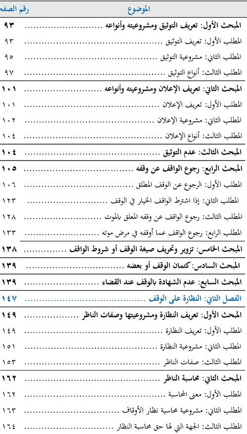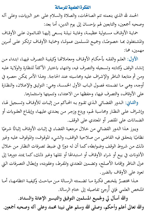 الأول: العلم والفقه ...بأحكام الأوقاف ومعاملاتها وكيفية التصرف فيها، ابتداء من إنشاء الوقف وكتابته وتسجيله والتصرف فيه، وانتهاء باختيار الأكفأ للنظارة والولاية عليه ومن ثَم متابعة الناظر والإشراف عليه ومحاسبته عند الحاجة.